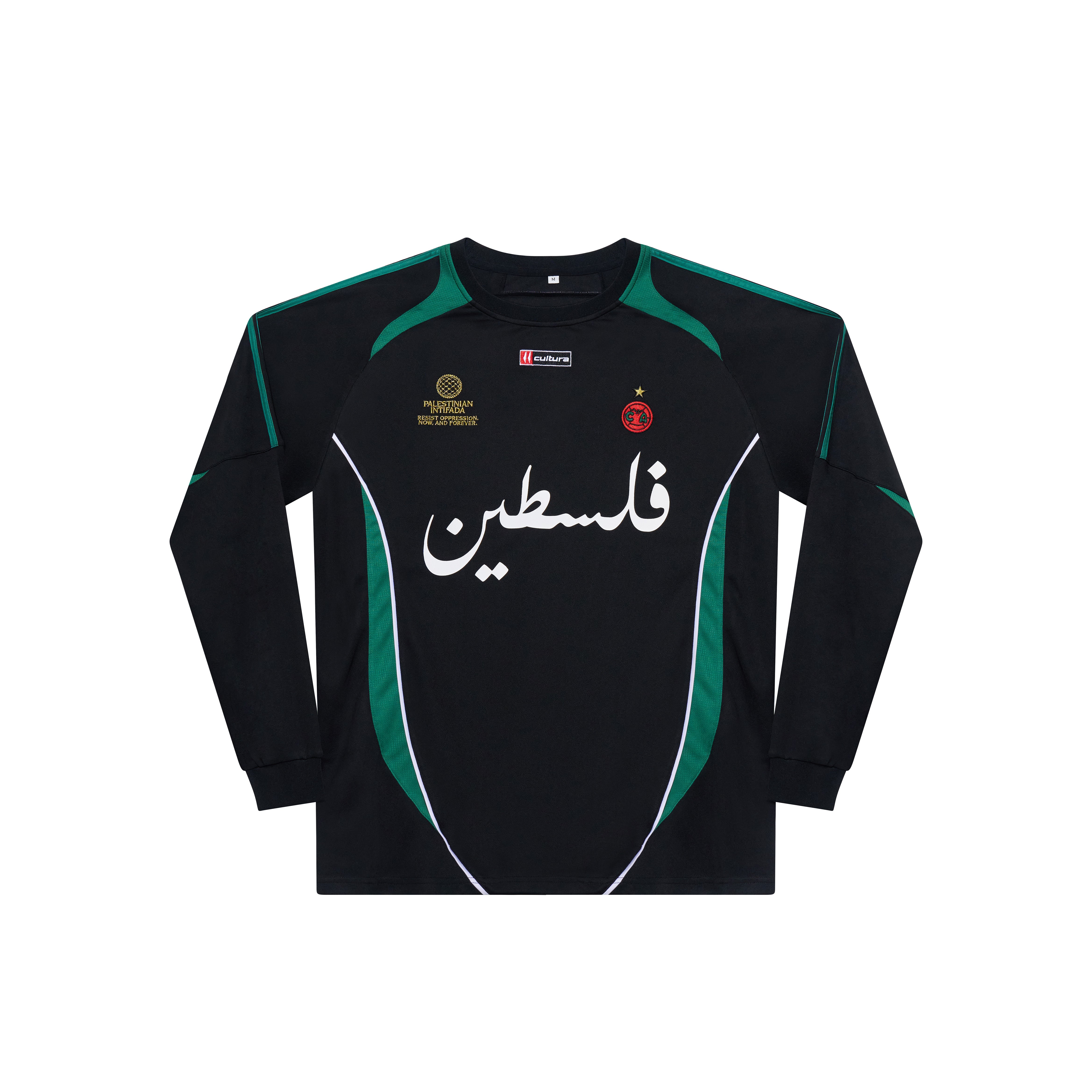 - Embroidered Cultura logo, signature 'keffiyeh globe,' and the Cultura Athletic MENA logo
